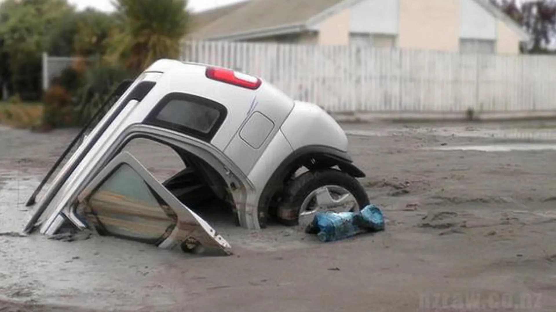This is what liquefaction looks like in real terms, things that can’t possibly sink into earth do sink, sometimes right out of sight.
